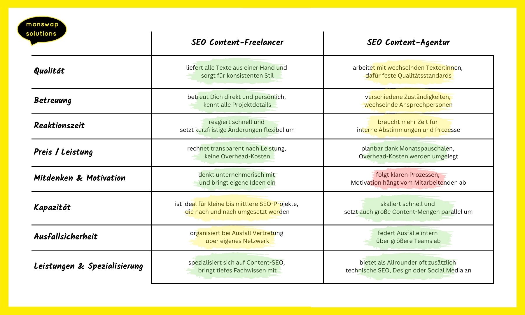SEO Content-Freelancer denkt unternehmerisch mit und bringen eigene Ideen ein, während Agenturen stärker auf Prozesse setzen und die Motivation stark vom jeweiligen Mitarbeitenden abhängt.